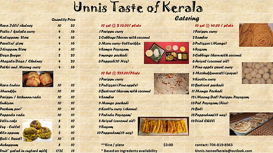 Tel: +1-704-819-8563 | Email: Unnis.tasteofkerala@outlook.com